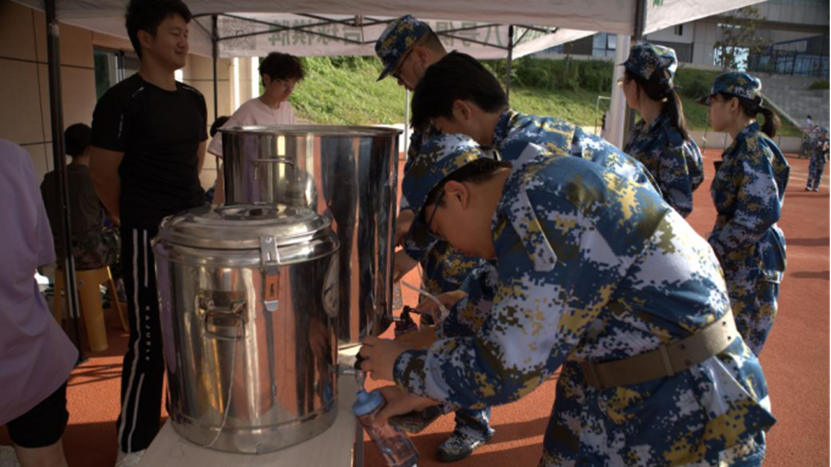 “膝盖后顶,收腹挺胸!”教官穿梭在队伍中,耐心纠正每一个细节动作;身旁的同学悄悄调整姿势,用眼神传递“坚持住”的鼓励。从基础的队列训练到简单的步伐变换,“化小水”们认真领会动作要领,反复练习;齐步走时,努力让脚步声连成一片;转向时,力求每一个转身都整齐划一。