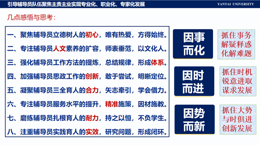 正科级辅导员张成友以“基于新时代高校辅导员队伍的专业化、职业化、专家化发展大势的思考”为题,传达学习了南京培训过程中的7个专家报告内容及实践教学的成果,强调思政工作需紧扣时代背景与学生需求,注重从日常细节中防范风险,守护学生心理健康,更要在实践中探索符合学院特色的育人模式。最后,结合培训,张老师凝练出“八大感悟”与老师们分享心得体会。