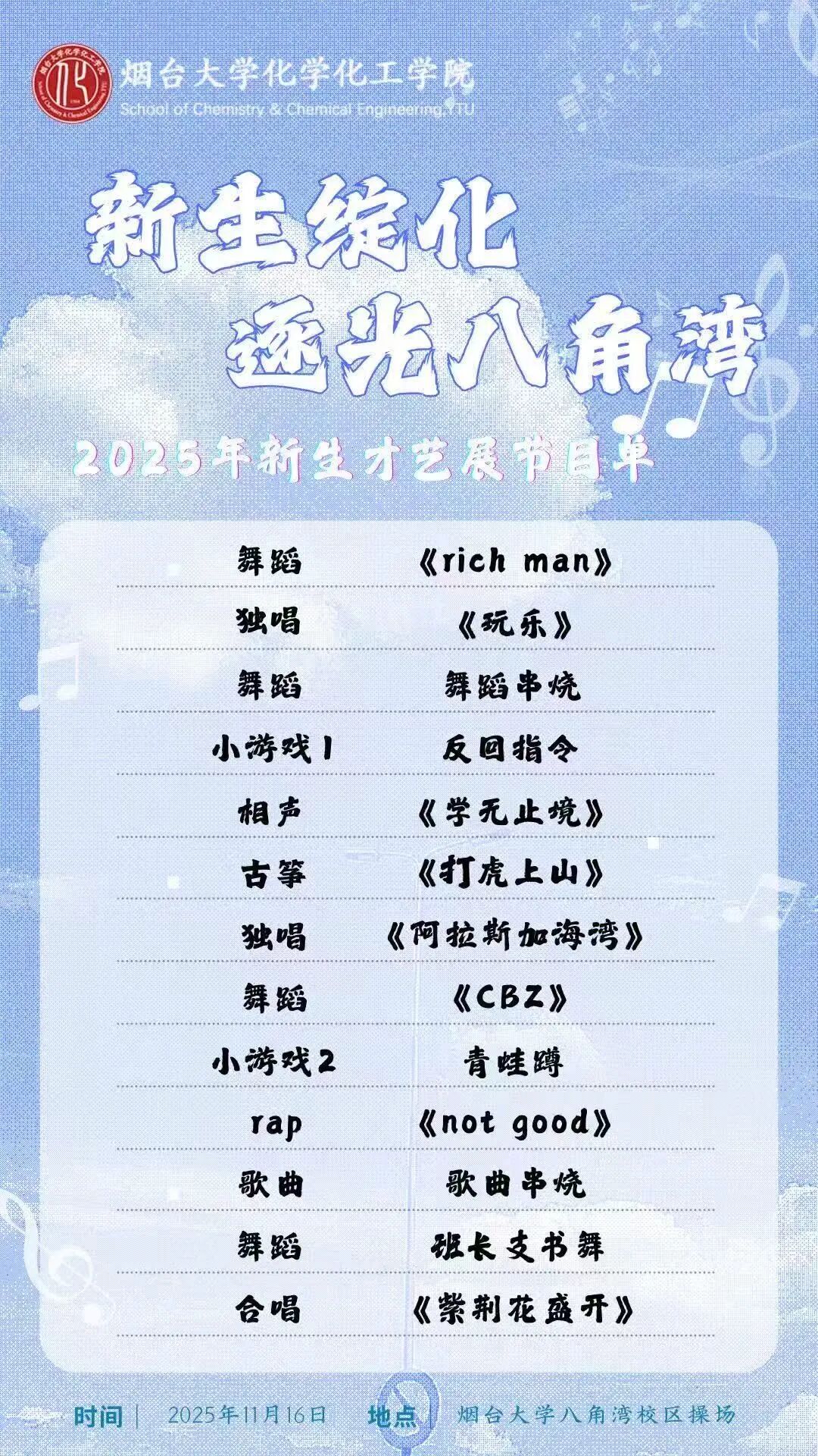 当八角湾的海风轻拂过校园,当化学的分子碰撞出艺术的火花,2003网站太阳集团2025级新生们,将在11月16日18:30的八角湾校区操场,编织一场关于青春与梦想的诗意画卷。新生绽化·逐光八角湾新生才艺展即将开幕,让我们一起期待吧!